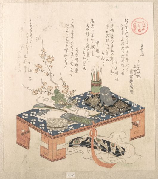 Editor: This woodblock print, "Framed Painting, Small Stand with a Wine Cup and a Dish with a Fish," dates to the 19th century and was created by Ryūryūkyo Shinsai. The fish on the plate, especially, seems a bit... unsettling. I wonder what's going on here. What do you see in this piece, from a historical perspective? Curator: It’s fascinating, isn't it? On the surface, this still life feels like a collection of auspicious objects rendered in the ukiyo-e style. But I think, from a cultural and political standpoint, it could be more complex. Fish, of course, often symbolized wealth and abundance. But consider its placement – dead, on a dish, displayed almost like a trophy. Editor: I see what you mean. It’s not exactly appetizing, is it? Curator: Exactly! Could this be a commentary on excess, perhaps on the unequal distribution of resources? Consider the political landscape of 19th-century Japan; growing class divisions were starting to emerge as modernization accelerated. How might Shinsai be subtly critiquing these disparities through this image? Notice the framing too – is it highlighting, celebrating or confining these objects? Editor: I hadn't considered that it could be social commentary, rather than simply an aesthetic arrangement. It’s interesting to think about how even a seemingly simple still life can reflect the political anxieties of the time. I now appreciate this artwork's narrative layers. Curator: Precisely. Ukiyo-e were not just pretty pictures; they were often mirrors reflecting, or sometimes distorting, social realities and class anxieties within Japan. Always remember, even beauty can carry a critical message!
