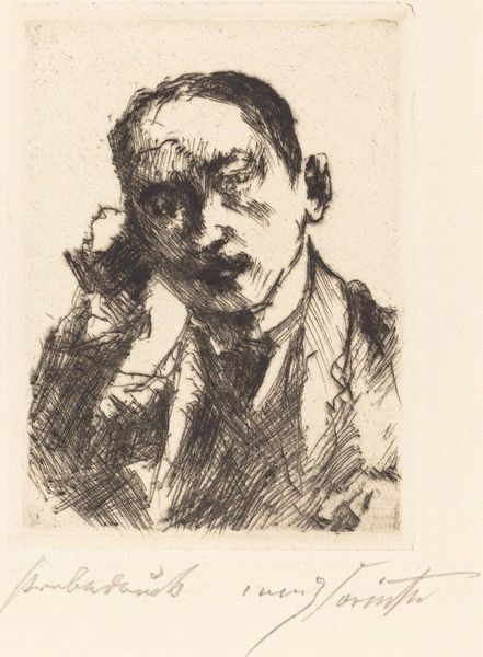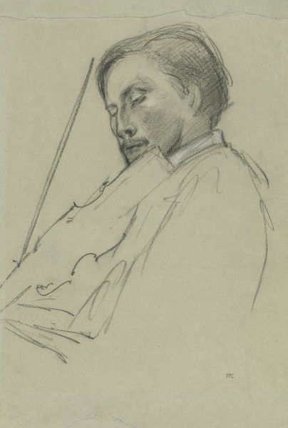 This is "Peinzende jongeman met sigarenpijpje," or "Pensive young man with cigar pipe," a pencil drawing by Jac van Looij. The composition immediately directs our gaze to the sitter's face, framed by his hand and the stem of the pipe. Looij’s masterful use of line and shadow constructs the pensive mood. The face is softly modeled with delicate hatching, while the background dissolves into a blur of vertical strokes, creating depth through contrast. The subject’s introspective gaze aligns with late 19th-century Symbolist concerns, capturing an internal psychological state rather than mere external appearances. The cigar pipe, a common symbol, here evokes a sense of contemplation. Note the economy of line and tonal range which suggest form, and how this creates an emotional connection. Through careful study, Looij prompts us to contemplate the intangible realm of human thought and emotion.