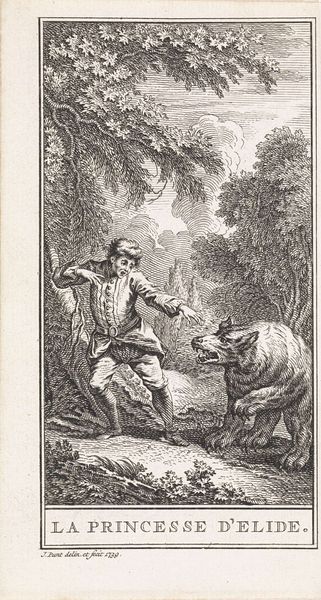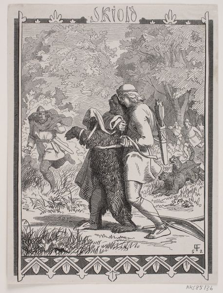 Curator: This artwork is “Drawing for the Primer Bear,” created around 1905 by Hans Thoma. It currently resides here at the Städel Museum. Look closely—it’s rendered in pen and ink. Editor: My first thought is—how incredibly charming! There’s this slightly unsettling undertone, seeing this great, lumbering bear made to dance, and I wonder what kind of story it is that this evokes for me. The quickness and lightness of touch with the ink reminds me of childhood, storybooks, things imagined… Curator: Well, the choice of pen and ink reflects its practical purpose. This was meant to be reproduced in a primer, a children’s book. Thoma probably opted for these materials for ease of reproduction at the time. But you're right, there’s a definite tension—this wild creature controlled by, what appears to be, musicians. Editor: Controlled is a perfect word. I wonder what kind of work the person playing those maracas must have put in. All these materials— the costume, the bear chain…it’s as if there is someone benefiting, but at the expense of this magnificent beast. Do you feel sympathy for the bear? Or awe? Curator: I think Thoma manages to capture both. There is a raw energy in the bear's form—you can almost feel the weight of it. But then you notice the delicacy in the lines that suggest its forced movement. It's a complex dance, captured with seemingly simple tools. I appreciate its brutal honestly about the labor required, but is any of it worth the cost? Editor: Yes, even the act of making the image mirrors the themes. The directness of ink on paper…there’s no hiding, no going back. The work has this immediacy and it does echo the power dynamic it depicts, very thought-provoking. I do not think you will forget it quickly.