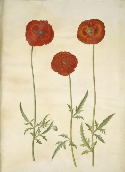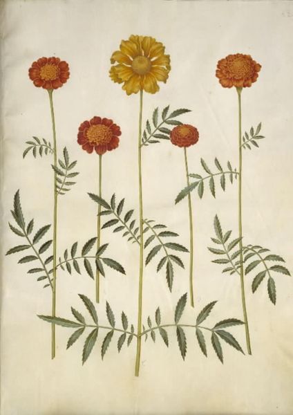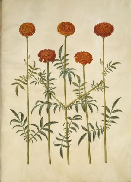 Editor: We’re looking at a botanical illustration of marigolds, or *Tagetes patula* and *Tagetes erecta* to use their Latin names. It's rendered in gouache and drawing on paper by Hans Simon Holtzbecker from sometime between 1649 and 1659. I’m immediately struck by the almost photographic realism – a testament to detailed observation. What details jump out at you? Curator: Well, it's less photograph and more… memory. Holtzbecker captures the *essence* of the marigold. It’s Northern Renaissance, so think Dürer’s clumpy turfs of grass suddenly bursting into bloom. These blooms, individually, they almost have personalities, don't they? A sort of gentle, introspective joy. I imagine Holtzbecker spending hours coaxing these portraits onto paper, not just documenting, but really feeling the texture, the colour. Editor: I hadn't considered the emotional investment. It felt purely scientific before. Curator: And yet, what is science *but* a form of love? He obviously relishes each petal. Gouache gives such a rich, almost velvety texture. Imagine him, centuries ago, in a sun-drenched room, capturing the last light on these blooms. Are you picking up on the subtle variations in the greens of the leaves too? Editor: Yes! Now that you point it out, the leaves do feel alive. I was so focused on the flowers, I nearly missed them! The way they jut out is amazing! Curator: It's a quiet, insistent beauty, wouldn’t you say? Editor: Absolutely. It makes me want to look at everything more closely from now on, to find that hidden personality. Curator: Exactly! Isn't that the greatest gift art can offer?