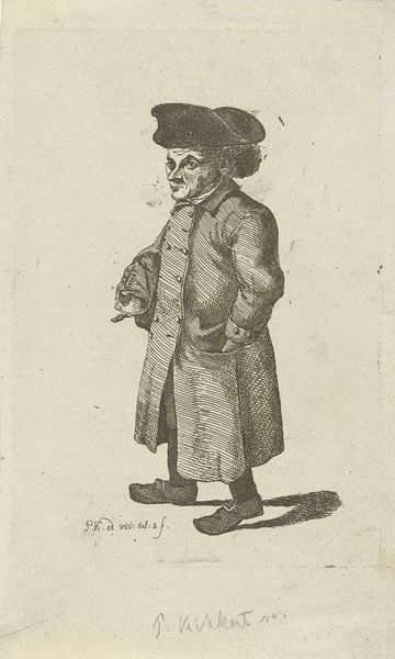 Johannes Drappentier etched this portrait of Hans the Swiss dwarf, likely in the late 17th or early 18th century in the Netherlands. The image presents us with a number of complex ideas about social class, disability, and representation. Hans is depicted in a style that exaggerates his physical features, a common trope in depictions of dwarfs at this time. He's dressed in finery and holds himself with an aristocratic bearing, with the hat, sword and cane, but the overall effect is somewhat comical to our eyes. To understand this image, we need to consider the historical context in which it was made. During this period, individuals with dwarfism were often employed as court jesters or entertainers, their physical differences both a source of amusement and a signifier of status for their patrons. This portrait, therefore, raises important questions about the power dynamics inherent in representation and the ways in which social norms can shape our perceptions of others. We might look to other images of court jesters or consider histories of disability to better understand this work. Ultimately, the meaning of this image is contingent on its social and institutional context.
