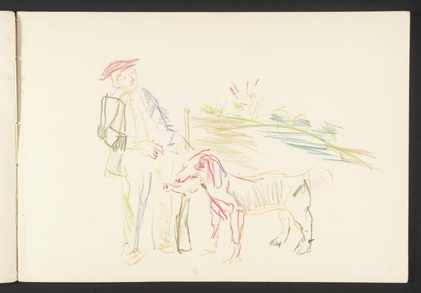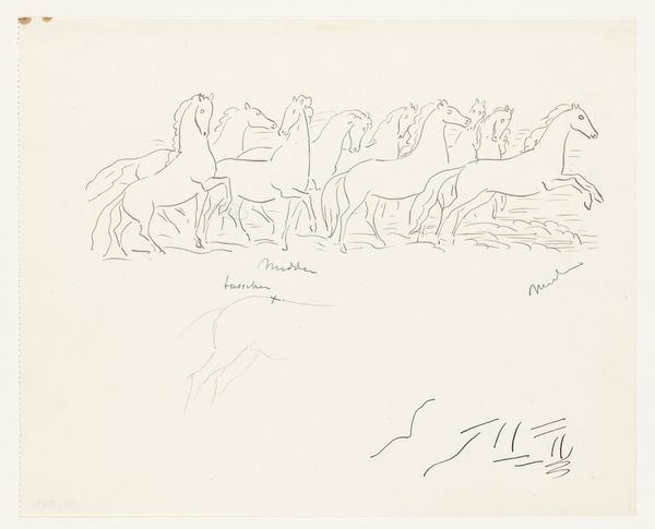 Leo Gestel sketched ‘Cow and Three Horses’ using graphite on paper. The faint, almost translucent lines give the artwork a delicate, ethereal quality. The composition is structured around a cluster of animals, forming a dense, almost pyramidal shape in the center of the paper. Gestel employs a minimalist approach, reducing the forms of the animals to their most basic outlines. This simplification invites us to consider the underlying structure and rhythm of the composition. The lines, though sparse, are carefully placed to define the contours and suggest depth. This evokes a sense of stillness and contemplation. The drawing’s emphasis on form over detail can be seen as part of a broader artistic trend of simplifying and abstracting natural forms to reveal their inherent geometric qualities. The ethereal quality reminds us that art’s meaning is always open to interpretation.