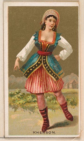 This is "Flora," a chromolithograph trading card from the Ballet Queens series, created by William S. Kimball & Company. The composition centres on a ballet dancer, her pose a study in contrasts. Note the striking use of colour: the deep reds and browns of her costume against the pale backdrop create a visual tension. The materiality of this chromolithograph, with its layered inks, speaks to the era's fascination with mass production. Yet, within this context, the artist manipulates line and form to suggest movement. Her body is arranged to convey a dynamic sense of rhythm. How does this image challenge established meanings? The dancer, a public figure, is simultaneously objectified and empowered. The image invites us to question the power dynamics inherent in representation and the cultural codes that inform our understanding of beauty and performance.