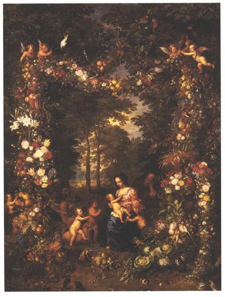 Jan Brueghel the Younger painted this oil on canvas, The Holy Family Within a Garland of Fruit, Flowers and Vegetables Held by Angels, in Antwerp. Floral garland paintings were a popular genre in early 17th century Flanders. What we see here is not just a devotional image, but also a display of wealth and status. Exotic flowers and fruits, meticulously rendered, evoke the bounty of the natural world. The Catholic Church, a major patron of the arts, used such images to reinforce its authority and project an image of abundance and prosperity, especially important after the iconoclasm of the previous century. In the context of the Counter-Reformation, art became a powerful tool for reaffirming religious doctrine and celebrating the material world as a reflection of divine grace. Brueghel’s painting speaks to the social conditions that shape artistic production, reflecting a culture deeply rooted in religious tradition and the patronage of powerful institutions. To delve deeper, scholars consult archival records, religious texts, and social histories to understand the complex interplay of art, religion, and society.