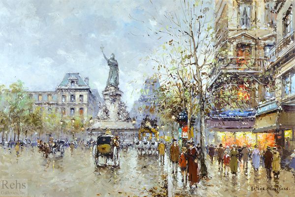 Editor: So, this is Antoine Blanchard's *Place de la Republique*, painted with oil paint. It really captures the hustle and bustle of city life, doesn't it? All the horse-drawn carriages and people hurrying along. How would you interpret this work? Curator: It's interesting to consider Blanchard's painting within the context of early 20th-century Parisian society. The Place de la Republique, with its monument celebrating the ideals of the French Republic, became a focal point for national identity. Notice how Blanchard captures the vibrancy of Parisian commerce and leisure. What does the subdued palette and hazy atmosphere suggest to you about the time period and the artist's intentions? Editor: Hmm, the colors do feel muted. Almost like looking at a faded photograph. Maybe it’s about nostalgia? A romanticized memory of the past? Curator: It could be, but consider this: Blanchard painted these cityscapes primarily for the tourist market. They offered a romantic image of Paris, reinforcing its status as a cultural capital and a desirable destination. How does that influence your view of the artwork? Editor: I guess I assumed it was just a simple snapshot of daily life. Now I see that it was actually constructed to promote a specific image of Paris, not just document it. Interesting! Curator: Exactly! The painting serves as a cultural artifact, reflecting and reinforcing the perception of Paris in the early 20th century. Understanding that shifts how we engage with its artistic choices, right? Editor: Definitely. I'll never look at a cityscape the same way again. Thank you! Curator: My pleasure. It’s always about uncovering those layers.