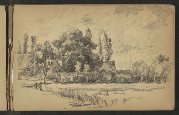 Editor: This is "Landschap met molen" from 1896-1897, by Willem Cornelis Rip, a landscape drawn in pencil. It's such a simple sketch, yet it captures a feeling of openness and stillness. What catches your eye when you look at this? Curator: Immediately, the directness of the pencil strokes speaks volumes. Look how Rip uses this readily available material – pencil on paper – to depict not just the image of a landscape with a windmill, but also the very labor inherent in agrarian society at the turn of the century. It challenges the grand narratives of the time by showing work, the base of human experience and societal structures, in such a 'simple' sketch. Do you see the implications there? Editor: I think so... it's like he's making the act of observing and working in the landscape a single, unified action, refusing to separate art from the everyday. Curator: Precisely. It elevates what was previously considered craft – sketching, the initial process – to high art. Consider the accessibility of these materials, contrasting that with the often idealized representations of landscapes from the period that mask realities. What does the focus on these very accessible materials tell you about its potential audience? Editor: Well, if he’s choosing something as basic as pencil and paper, it could mean he was thinking about who could consume or even make art... perhaps making a statement about who has the means or permission to represent their world. It seems almost…democratic? Curator: Exactly. And this ‘democratic’ material application forces us to reconsider who gets to participate in the art world, and what constitutes "Art" with a capital "A" in the first place. That he focused on these humble and primary modes of material exploration of the physical location says something profound. Editor: It really makes you think about the choice of material, not just the finished picture, doesn’t it? Thanks. Curator: Indeed, and how that informs social and cultural hierarchies around art production and value.