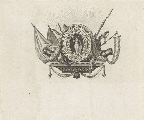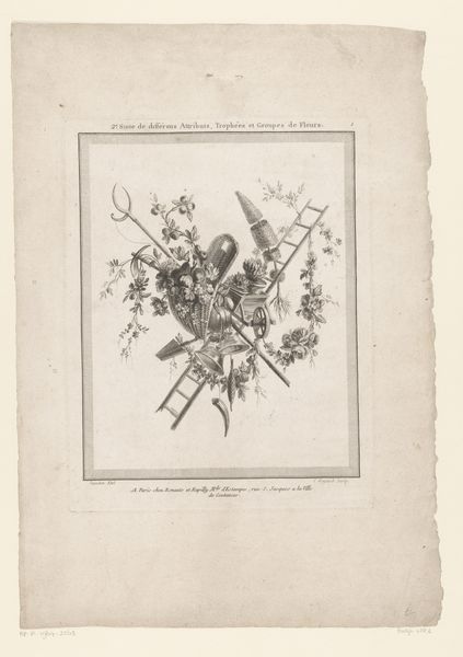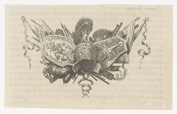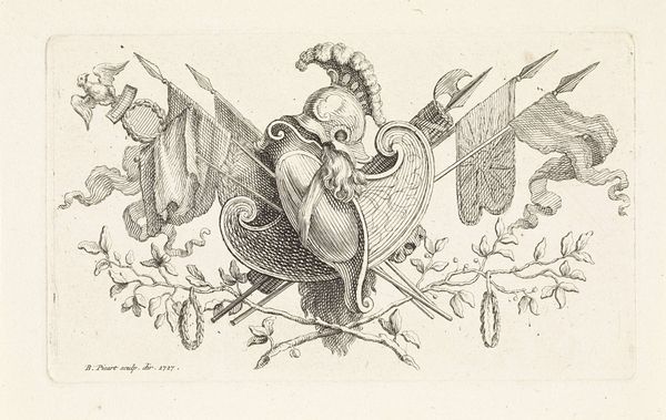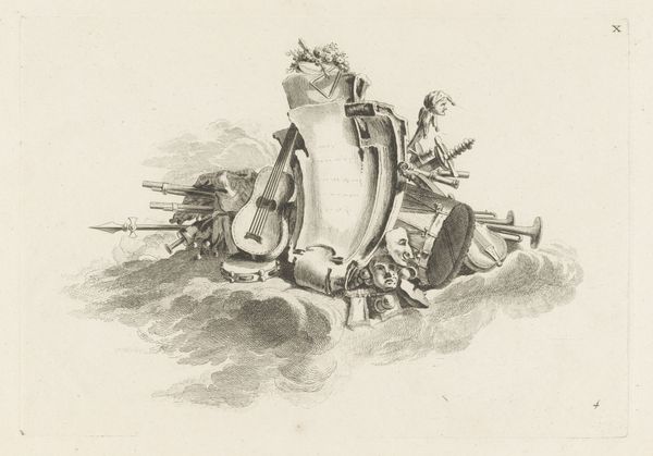 Bernard Picart created this print, "Attributes of Science and the Arts," in the late 17th or early 18th century, a period marked by significant intellectual and artistic developments. Picart was working during the Enlightenment, a time when reason and individualism were gaining prominence. The image presents a carefully arranged collection of objects representing both scientific inquiry and artistic creation. We see instruments like globes and astrolabes, alongside items such as musical instruments, books, and drawing tools. Interspersed with weapons, the ensemble suggests a narrative about the interplay between knowledge, creativity, and power during the Age of Enlightenment. This was a period deeply shaped by colonialism, where scientific advancements and artistic expressions were often intertwined with imperial ambitions. Consider how this collection of objects, presented as symbols of progress and enlightenment, might obscure the complexities and contradictions of the era. What stories remain untold in this carefully constructed image? How do you feel when looking at this collection?