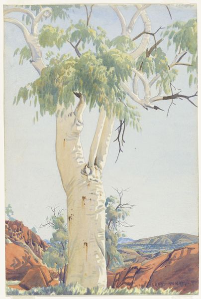 Albert Namatjira painted this watercolour, "Ghost Gum," capturing the stark beauty of the Australian landscape. The Ghost Gum itself dominates the composition, its smooth, white trunk a striking vertical form against the soft blues and greens of the outback. Note the artist’s use of light and shadow to model the tree’s form, lending it a sculptural presence. Namatjira’s approach is interesting; he adopts a Western style of landscape painting, yet infuses it with his own cultural perspective. The seemingly objective representation of the natural world is, therefore, layered with complexities. How do we interpret this intersection of styles? Does it challenge fixed notions about Indigenous art, or perhaps offer a critique of Western art traditions? Consider the way Namatjira directs our gaze through the composition. The Ghost Gum acts as both a subject and a structural element, framing our view of the distant hills. It is through this lens that we can continue to examine the visual and cultural dialogues in Namatjira’s work.