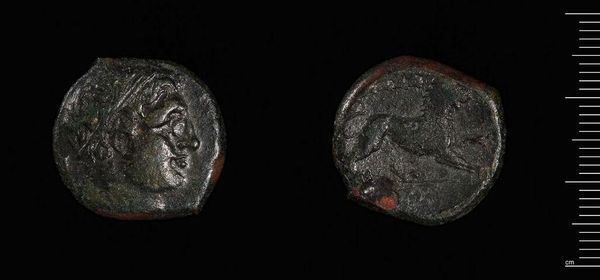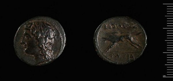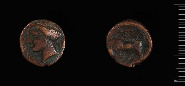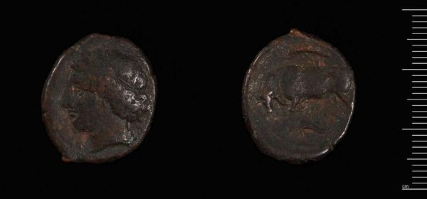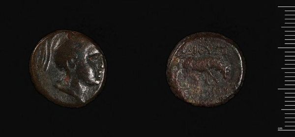 Curator: Here we have a coin of Agathokles, Tyrant of Syracuse. Editor: It looks weighty despite its size, the low relief casting a mood of somber authority. Curator: The obverse shows a portrait, presumably of Agathokles himself, and the reverse a bull. Editor: A bull surely meant something significant in that society, not just an animal but a symbol of power. I wonder how that was translated to the masses who handled this coin daily. Did it reinforce his dominion? Curator: Quite possibly. The use of such imagery was deliberate, lending symbolic weight to his rule through this small material object. Editor: It's a potent reminder that even the smallest artifacts can speak volumes about larger power structures. Curator: Indeed, the interplay between form and implied narrative is compelling.