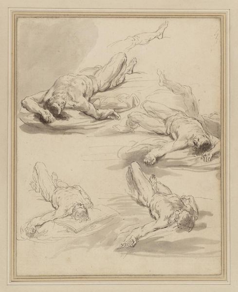 Editor: This is Nicolas Le Sueur's "Fall of the Rebel Angels," a drawing, and the figures feel so dynamic! What can you tell me about it? Curator: Considering the materiality, look at the labor involved in creating this image and how the artist represents a hierarchy through the medium itself. The angel is sketched with clarity, but consider the fallen rebels—are they depicted with the same care? Editor: Not really, they seem more like masses than individuals. Curator: Exactly. This reflects a deliberate choice about how labor is valued and represented. How does this connect to the consumption of religious art at the time? Editor: I guess patrons wanted to see the triumph, not the messy details of the defeated. That’s a different way to look at it. Curator: Precisely. Thinking about process and materials helps us understand the social context.
