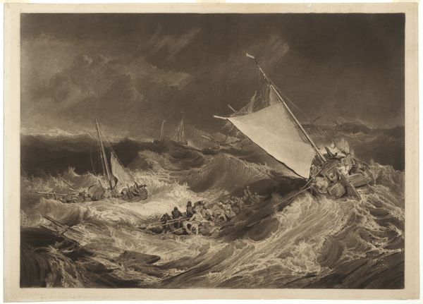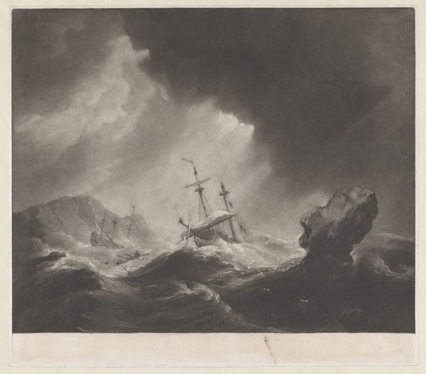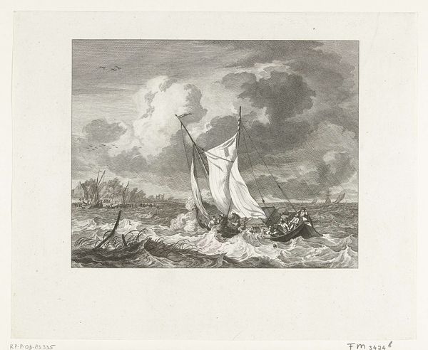 Editor: This is "The End of a Storm at Sea," an engraving from sometime between 1752 and 1816, currently held in the Rijksmuseum. The detail is incredible, and the artist really captures the movement of the waves. What stands out to you from a formal perspective? Curator: The composition immediately draws my attention. Notice how the artist has structured the space. The diagonal lines of the waves create a dynamic rhythm that moves the eye across the surface. The varying densities of line also produce interesting tonal variations that really make it an interesting work from a purely technical point. Editor: I see what you mean about the rhythm. It's almost musical. What about the use of light and shadow? Curator: Indeed, the engraver has used chiaroscuro, not to create illusionistic depth, but rather as an arrangement of contrasting forms, independent of a single, consistent light source. For instance, the clouds are treated as textured blocks against the lighter sea. Ask yourself, what function do the small, precise lines describing the ships fulfill? Editor: I think they contrast with the more gestural lines used for the water and sky. They show the skill involved to depict the boats! It does so much by varying those different engraving line techniques. Curator: Precisely. What's also crucial to note is the surface of the print itself – its texture and how it interacts with light. These physical properties contribute to its overall aesthetic impact. Editor: So it's not just what's depicted, but also how it's depicted, and what it’s depicted on! I'll definitely look more closely at technique now. Curator: Always return to the visual experience of the art itself, interrogate the formal arrangements that contribute to meaning and affect.