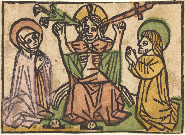 This image, 'Christ Appearing to the Apostles', presents a scene rendered in a style characterized by bold outlines and simplified forms. Notice how the artist uses a limited palette of earthy tones, punctuated by brighter yellows and greens, creating a visually distinct and emotionally evocative composition. The arrangement of figures, with Christ floating above a landscape as the apostles cluster below, invites a structural analysis. The artist uses a combination of line and color to flatten the space, creating a hieratic image where symbolism overrides naturalistic representation. The repetition of similar facial features and gestures among the apostles may suggest a collective response to the divine apparition, each figure a semiotic marker of faith and reverence. The formal qualities—the deliberate flattening, the limited color range, and the stark linearity—serve to amplify the spiritual message, directing our attention towards the symbolic rather than the literal. This piece reminds us that art continually redefines our understanding of representation and belief.