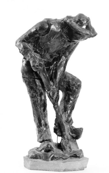 Curator: Edgar Degas, best known for his paintings of dancers, also created a series of sculptures later in his career, including this bronze, "Dancer Putting on Her Stocking (First State)," modeled between 1891 and 1920. Editor: The texture! The materiality feels so raw. There is a real sense of the artist's hand in shaping the bronze. Yet the contorted pose is slightly unsettling, like an interrupted private moment. Curator: I find it more elegant. The work uses distortion and asymmetry, departing from classical sculpture ideals of harmony, to create a fascinating dynamic. We see this same focus reflected in his pastels and paintings. Editor: Perhaps, but let's think about the broader context of these dancer figures. Degas often depicted these women as objects of the male gaze, emphasizing their bodies and reducing them to spectacles for a largely male, upper-class audience. Do we see a similar objectification here? Curator: It is not necessarily about objectification but about capturing a modern aesthetic in his radical depiction of form. The impressionistic manipulation of shape itself is interesting because he focuses on conveying the sensation of movement rather than hyper-realism. The piece uses sharp edges to break away from the classical forms, like his paintings with cropped perspectives. Editor: It is definitely productive to talk about both technique and context because this bronze speaks to the complex position of women in Parisian society at that time, especially within the world of ballet—a rigid environment where they were constantly assessed, disciplined, and keenly observed. Curator: Your points are definitely valid and give insight into understanding the possible perspectives around this work. But regardless, it is evident that it reflects Degas' interest in challenging traditional notions of beauty through abstract, yet controlled distortion, an observation of pure motion and modern aesthetic rather than mere anatomical accuracy. Editor: Indeed. It highlights that no work exists in isolation. Analyzing it requires attention to materials and construction, like bronze's cold and rigid form in tension with the warmth of capturing human movement, and recognizing the historical environment where the artwork gains much deeper resonance. Curator: An understanding of both elements is fundamental for viewers engaging with a historical work like this today, agreed.