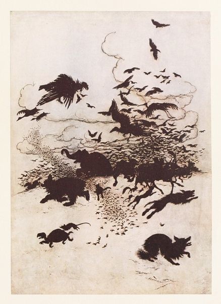 Curator: Hiroshige's "Three Dragons in Waves and Clouds" presents a dynamic scene, powerful in its monochrome simplicity. Editor: My first impression is a feeling of awe. The dragons seem both playful and terrifying, evoking a sense of nature's untamed power. Curator: Consider the dragon as a symbol of imperial power and wisdom in East Asian cultures. What sociopolitical message might Hiroshige convey with these three dragons dominating the seascape? Editor: Given the context of 19th-century Japan and its relationship to Western powers, these dragons could represent Japan's might in the face of external pressures. Or perhaps they reflect an idealized vision of national strength? Curator: Symbolically, waves and clouds often represent chaos and transformation. Hiroshige masterfully captures their energy. Editor: Indeed, the dynamism here reminds me that images become cultural battlegrounds, constantly renegotiated according to dominant narratives. Curator: A reminder that symbols are rarely static and their interpretation constantly evolves through different historical lenses. Editor: Precisely. It makes me wonder how future generations will interpret such potent imagery.