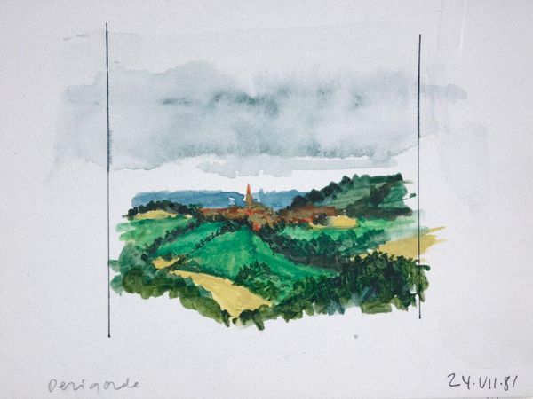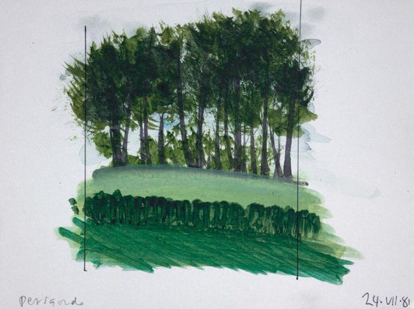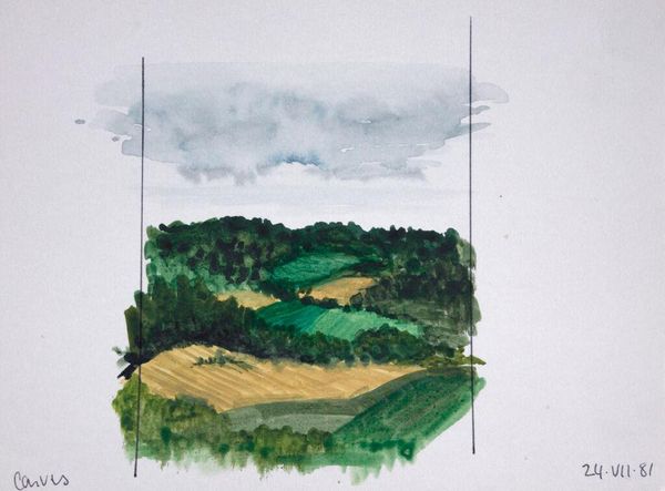Curator: This delicate watercolor by Elena Prentice, simply titled "Landscape," captures a bucolic scene. Editor: It's rather melancholic, wouldn’t you say? The muted tones and those almost violently vertical lines create an unusual sense of constraint. Curator: Indeed, the lines act as both a frame and a cage, almost. Perhaps they represent the march of industry encroaching upon nature? Editor: Or they could symbolize the artist's, or our own, internal boundaries when observing the natural world. The sky is heavy, pregnant with meaning, a shared cultural anxiety perhaps? Curator: The date on the lower right corner reads 24-VII-81, so we can place the artwork within a specific historical context, giving us insight into the socio-political climate of that time. Editor: I see it as a timeless representation of the delicate balance between humanity and nature, a symbol that resonates across generations. Curator: I appreciate how you've linked its symbolism to a broader cultural consciousness. Editor: And I the specificity of your historical lens, thank you.