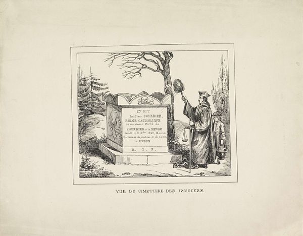 Curator: Here we have Joseph Hartogensis’ "Titelprent van: etsproeven 1856," dating from 1856. It's an etching and engraving, showcasing a rather intriguing landscape. Editor: Intriguing is one word. Bleak comes to my mind initially. The muted tones and desolate imagery certainly evoke a sense of melancholic isolation. What does it say? Curator: The sign reads, “On Zinc, Etching proofs, dedicated to my friends, 1856.” Note how Hartogensis meticulously renders the wood grain and the textures of the flora. There is an exquisite interplay of light and shadow achieved through masterful manipulation of line. Editor: Dedicated to friends, yet steeped in melancholy. This begs the question: What constitutes friendship in a world fraught with societal pressures and personal disillusionment, themes that resonate heavily throughout the Romantic and Realist movements of that era? Who are these friends and what shared struggles connect them? Curator: While those questions certainly bring forth avenues for discussion, perhaps they overshadow the intent of the artwork. From a purely aesthetic standpoint, it is quite fascinating to observe how he achieves such depth through the use of cross-hatching and varied line weights in the rendering of the foliage, trunk and the aged wooden plaque. Editor: The placement of the sign isn't random, though. Perched amidst encroaching nature, almost swallowed by its surroundings, does that reflect the state of art itself during that transitional period? Is it relevant for art to address societal matters or should art simply try to depict natural scenery? What should Art's role in society be? Curator: Your questions open so many doors. Let’s step back and note that, as an etching and engraving, it’s a study in contrasts—the crude nature surrounding this very refined medium. It shows his dedication to craft and friends as kindred spirits and fellow experimenters in the alchemic, ever shifting medium of printmaking. Editor: Exactly! In essence, Hartogensis provides a meditation on the intersection of friendship, art, and the inescapable weight of reality, demanding a deeper consideration. This bleak natural scenery challenges our very definitions of art and the importance we give it. Curator: I concede. Your reading certainly deepens the potential narratives interwoven into the composition. The dedication to his friends may be as relevant as his attention to craft. Editor: Precisely, that's the conversation I had hoped for, contextualized in the world it emerged from!