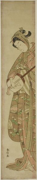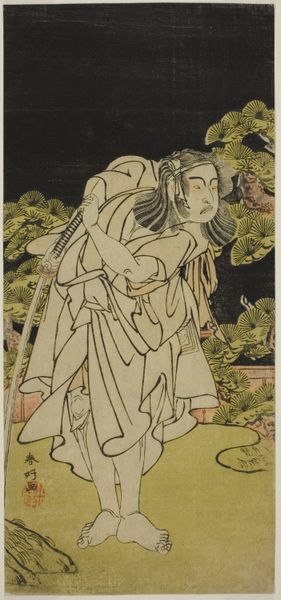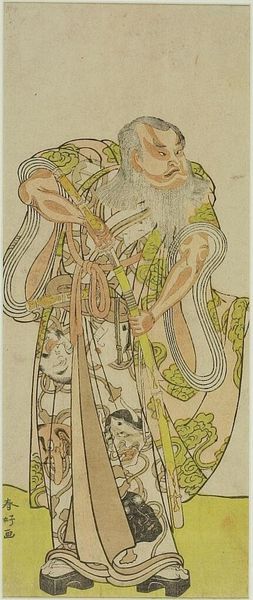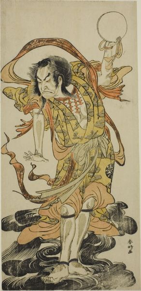 Editor: Here we have Katsukawa Shunko’s woodblock print from 1787, "The Actor Onoe Matsusuke I as a Mendicant Monk." It's... well, quite a striking image! He seems uncomfortable and rather… grumpy. How do you interpret this work? Curator: This print, beyond its immediate depiction of a popular actor, opens a window onto the complex social dynamics of Edo-period Japan. Notice how the figure is presented: the ragged clothing, the forced pose. It is definitely a caricature of a religious figure, challenging societal norms through the lens of Kabuki theatre. Editor: So, it’s not just a portrait of an actor, but also a kind of social commentary? Curator: Exactly. Kabuki often served as a space where marginalized voices could find representation, albeit sometimes in coded or subversive ways. This image uses caricature to question the established order, but I think we need to ask; what does this particular role signify in its cultural context? What kind of stereotypes are at play here? Editor: It’s interesting to think about how art can both reflect and critique society simultaneously. Curator: Absolutely. And consider how the artist might be using humor to disarm viewers, inviting them to question the very structures of power that shape their lives. It also provokes thinking around identity, gender performance in theatrical and visual contexts, what are the potential parallels of present social and cultural standards? Editor: That makes me rethink my initial, somewhat dismissive reaction. There’s a lot more depth here than I first realized! Curator: Indeed! Examining art through a socio-historical lens unveils how artists engage with their world, challenging norms and inviting us to critically examine our own. Editor: Thanks. Now I can appreciate that beyond the humour is some deeper social significance.