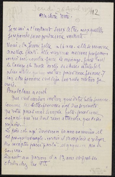 This is a letter, "Brief aan anoniem," by Emile Bernard, written with pen on paper. Look at the way the words crowd the page. The blue ink bleeds a little, softening the edges of each stroke, like watercolors. It feels intimate, like we're peering over Bernard's shoulder as he pours out his thoughts. I love the physicality of the writing. The way the letters loop and connect, a dance of ink across the page. Notice how some lines are bold and assertive, while others are light and tentative. It reminds me that writing, like painting, is a process of discovery. Each mark, each word, a step into the unknown. The page, with its grid-like structure, offers a sense of order, but the handwriting rebels against it, spilling over the lines, asserting its own rhythm. It reminds me a little of Cy Twombly, or perhaps even closer to home, the raw energy of Vincent van Gogh, with whom Bernard shared ideas, finding freedom in expression.