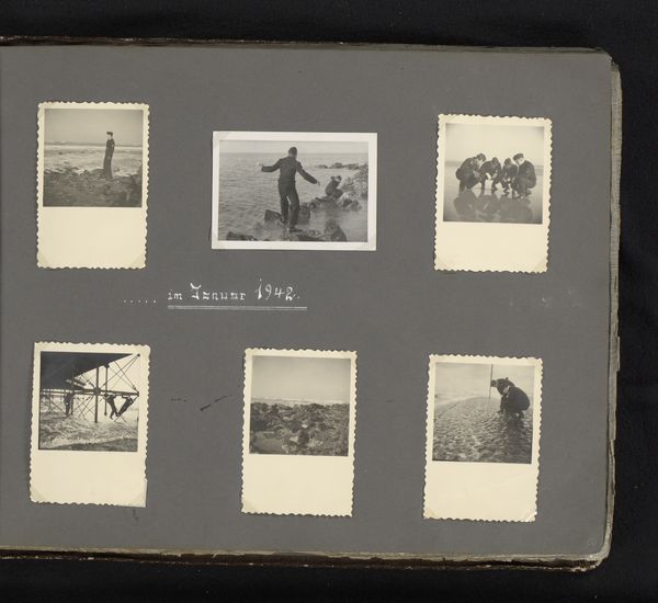 Curator: So, this photograph album page, "Kriegsmarine aan het strand van Scheveningen," taken in 1942, presents a series of gelatin silver prints mounted on a dark album page. The grainy texture gives it such a stark quality. What strikes you most about this object? Editor: Well, first of all, the collection of snapshots on this page looks so ordinary at first glance. It feels almost…domestic, which feels so strange considering it depicts German Navy members on a beach during the Second World War. What is interesting to you in this piece? Curator: It's fascinating how seemingly mundane snapshots become charged with meaning when we consider the context of their production and circulation. Look closely at the gelatin silver prints; the labor involved in their making and development, the specific chemical processes. Photography at this time was both a technology of control and a means of personal documentation. Editor: So, by focusing on the materials and processes, you’re saying we can see how photography itself became a tool within a larger political machine? Curator: Exactly. These aren't just images; they are objects produced through specific means, disseminated for particular purposes, be that personal memory or state propaganda. The paper, the chemicals, the photographer’s labor – it all speaks to a network of production deeply embedded in the war effort. The act of picturing became a type of wartime activity and also suggests consumption of war effort in terms of materials at play. Editor: I never thought about how even casual photographs required an entire industry during wartime. It's like the photo is the end product of so much labor and resources, some of which would have likely been restricted in wartime! Curator: Precisely. Considering its production allows us to critically examine photography's role, both as an aesthetic medium and a cog in the larger war machine. Editor: I learned something new today! Looking closely at process and materials really changed my perspective!