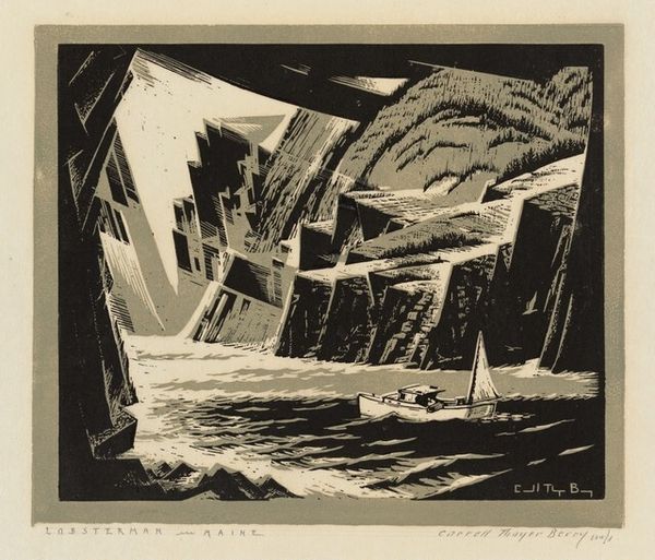 Curator: Immediately striking, isn’t it? A bit ominous, even. That heavy sky and those very graphic columns of rain... it feels like a stage set. Editor: Yes, there is a dramatic quality. This is Arnold Rönnebeck's "Rain Over Desert Mesas," a pencil print created in 1931. Rönnebeck was deeply engaged in portraying the American Southwest, and this work aligns with the Regionalism movement. Curator: It’s fascinating to see how Rönnebeck, working within this Regionalist vein, uses geometry almost brutally here. Those mesas are reduced to almost child-like geometric forms and look so at odds with the detail given to those dark rainclouds. He almost weaponizes landscape itself. I'm reminded of discussions around environmental justice; thinking about how land bears witness to power dynamics, especially during the Depression era. Editor: The formal austerity really reinforces that sense of isolation and perhaps even vulnerability. This was the early Depression, after all, a period of massive social upheaval. I wonder, though, if this aesthetic served not just to depict hardship but also to monumentalize the landscape in a way that bolstered regional pride during economic insecurity? Rönnebeck exhibited widely in this period; images like this one undoubtedly circulated and shaped perceptions of the Southwest. Curator: Definitely a crucial point to think about how these images were circulated. I feel this image could be a powerful visualization of ecological anxiety. The clean simplicity of the rendering serves to highlight an ideal being disrupted. The composition almost prefigures climate anxiety… and how nature is not as “forever” as we hoped for. Editor: Absolutely. The print’s deliberate simplicity invites us to consider the narratives it perpetuates and the audiences it addressed. Understanding how those depictions shaped the identity and image of the American Southwest is essential to interpreting works such as Rönnebeck’s, regardless of if we read it as an omen or as pride. Curator: This artwork seems to me like such a poignant lens through which to view contemporary conversations around climate, representation, and the politics of place. It really does give us all a new, deeper understanding, don't you think? Editor: I agree entirely. It’s rewarding to delve into the multifaceted interpretations and the lasting impact of Rönnebeck's art on American cultural identity.