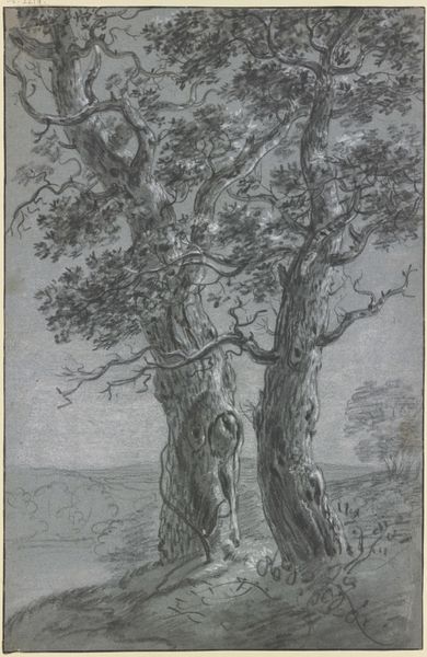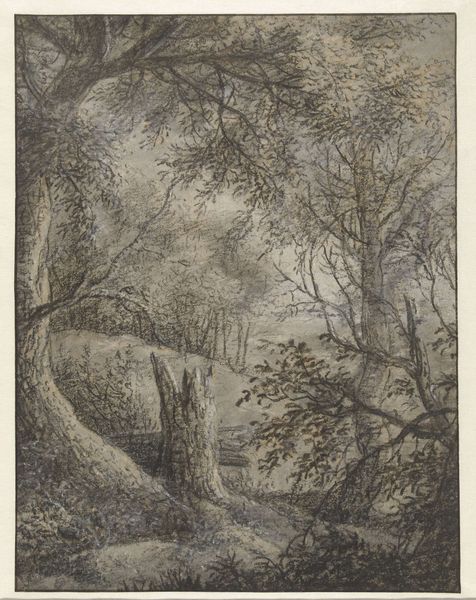 Curator: This is Simon de Vlieger's "Old Tree on a Hillside," estimated to have been created sometime between 1610 and 1653. Editor: Immediately, I’m struck by its melancholic stillness. The stark contrast, the lonely tree... it feels almost like a visual poem about resilience in the face of stark adversity, you know? The raw emotion in it just kind of sucks you in. Curator: Vlieger, though often overlooked in comparison to his contemporaries, was crucial in popularizing seascape and landscape paintings in Dutch Golden Age art. He frequently sketched outdoors. Notice the directness of the lines; they reflect his effort to authentically render scenes from nature. This was part of a larger cultural trend, actually. Editor: Nature as a subject – grounding! I imagine Vlieger, out in some field, charcoal in hand, battling the wind to capture this gnarly old tree, yeah? He probably felt the same things we feel now when looking at it! A certain… something sacred about those old natural formations. It is incredible what that piece, which may well be watercolor, manages to make me feel. Curator: The rising mercantile class of the 17th century desired tangible records of their surroundings. Paintings, especially landscapes, affirmed their connection to the land and symbolized burgeoning national pride. His compositions weren't mere reproductions; they conveyed a specific idea about the human-nature relationship. Editor: It's almost as if the tree is reaching, struggling to break free of the earth and the weight of existence. Simultaneously strong and desperately reaching for survival... A kind of stoic determination there; beautifully heartbreaking. I imagine it as some kind of metaphor for human striving or just old age. What do you make of that somber tone? Was it intentional, do you reckon? Curator: Given the historical context, with the Eighty Years' War recently concluded, artists were very keen on visually establishing Dutch territories. While I cannot know with certainty that this symbolism was intended, I find it hard to look past this as a distinct possibility when considering this era's social and political motivations. Editor: Maybe… Maybe. Even without intentional metaphors, I think the universal pull is undeniable, wouldn't you agree? Whatever Vlieger was thinking, this tree still speaks volumes, and across centuries no less. A very special tree, that. Curator: Absolutely, the enduring power of images lies partly in their ambiguity, prompting continuous re-interpretation and resonance across time and cultural contexts. Thank you. Editor: For sure. Now I must wander back to my studio; time to chase some stubborn muses and old trees.