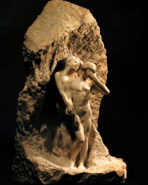 Editor: Henri Teixeira de Mattos's "The Flood," crafted around 1885 in marble, powerfully captures a moment of chaos. Its dynamic composition is overwhelming and emotionally intense. What narratives or historical contexts do you think informed its creation? Curator: This sculpture demands we consider the socio-political anxieties of its time. The late 19th century was marked by rapid industrialization, urbanization, and shifting social structures. Catastrophic events, like floods, can be interpreted as metaphors for the anxieties about societal collapse, revealing power structures and vulnerabilities within a community. Who benefits, and who suffers the most? Editor: That makes sense. The figures struggling in the water clearly reflect the disproportionate impact of disaster. It also reminds me of classic biblical flood narratives. Curator: Precisely. Biblical narratives often serve as cautionary tales. Think about how this artist chose to depict the figures - their idealized bodies and dramatic poses. How does this aesthetic choice play into the narrative being presented? Does it evoke a sense of heroism amidst tragedy, or does it perhaps gloss over the true, gritty reality of such events? Editor: I hadn't considered the idealization as a potential distancing technique. It does seem to almost romanticize the suffering, which feels… complicated. Curator: It's a tension inherent in academic art. Reflect on what purpose "history painting" served at this moment. The artistic style might be communicating certain political ideals or moral lessons. By examining this piece, perhaps we can see how even in art that aims to depict historical or mythical events, we're truly seeing a reflection of the society that produced it. Editor: I see that so clearly now. It's about more than just the flood; it is speaking about that era's particular ideas about virtue, history, and society itself. Curator: Exactly. And by understanding those values, we gain a richer perspective on the sculpture, and more importantly, the time and social context it reflects.