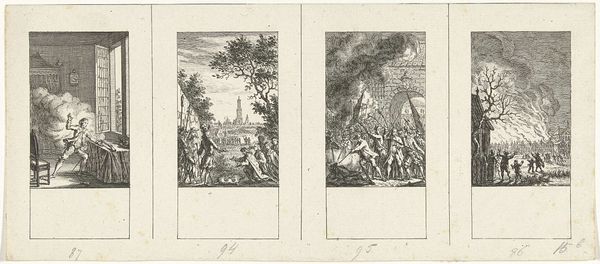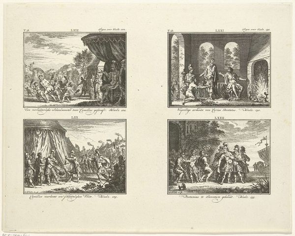 Simon Fokke created this print around 1740, depicting four scenes from classical history using etching. Dominating the bottom right is the Siege of Rhodes, illustrating a moment of intense conflict. A central figure points dramatically towards a fortified city, a gesture laden with command and aggression. This assertive hand, directing action and fate, echoes through art history, a recurrent motif signaling power and intent. Think of Roman emperors addressing their legions, or Renaissance depictions of biblical prophets. This gesture taps into a primal, almost subconscious understanding of leadership and control. But gestures, like all symbols, evolve. The commanding point can also signify accusation or blame, its meaning shaped by context and culture. The intensity of the scene—the siege, the smoke, the pointing figure—engages us on a visceral level, evoking the chaos and emotional turbulence of war, a timeless human experience.
