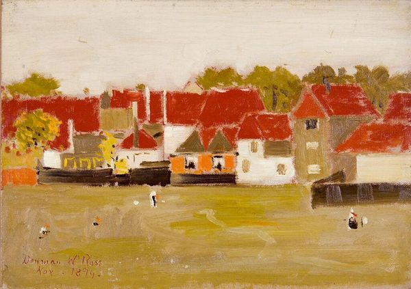 Curator: Here we have a small watercolor titled "Landscape" by Denman Waldo Ross, part of the Harvard Art Museums collection. Editor: It's remarkably serene, isn't it? The muted palette evokes a palpable sense of quietude. Curator: Ross was deeply invested in color theory; the interplay of tones here, especially the ochres and pale blues, creates a sophisticated, harmonious visual field. Editor: The architecture almost feels secondary, perhaps symbolic of human presence in a broader natural context. The buildings seem softened, absorbed. Curator: Precisely. Note how the forms are simplified, almost abstracted. It is less about depiction and more about the formal arrangement of shapes and values. Editor: There's a subtle melancholic quality to the piece, maybe related to the unadorned trees or the lonely stream in the foreground. Curator: I find the composition itself quite masterful. The placement of the structures and the negative space work together to create a balanced whole. Editor: A balance that nonetheless invites reflection on the temporality of structures, human and natural. Curator: Indeed, a small but potent example of Ross's aesthetic sensibilities. Editor: Yes, a fleeting moment captured with an understated symbolic weight.