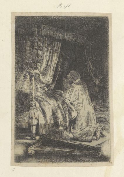 Curator: This is a sketch by Elizabeth Rigby from the Tate Collections, the date is unknown. My immediate impression is a study in contrasts, light and shadow, inside and out. Editor: It certainly speaks of the Victorian era and its focus on gender roles. We see the woman seated, almost confined to the domestic space, while the man is positioned near the window, seemingly ready to venture into the world. Curator: Precisely. Rigby, writing under her husband’s name, critiqued similar societal norms. The architecture – those Gothic arches – further encloses the scene, creating a visual metaphor for restriction. Editor: But note how the light falls, illuminating both figures. The crisp lines and hatching create a sense of depth, drawing the eye to the interplay of gazes and the subtle tension between them. It’s formally quite accomplished. Curator: The sketch anticipates the debates about women’s agency in marriage, a common theme in 19th-century literature and art. Editor: So, the composition and the narrative are intertwined. Curator: Absolutely, it's a compelling visual commentary on the social dynamics of the time. Editor: I see now, thanks to your contextual insights, how the artist's choices amplify the implied narrative.