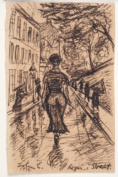 This ink drawing is by A. Tinbergen, and it shows a boy playing with a firehose on the street. The artist has used traditional materials, and combined them in an intriguing way. The drawing has a charming handmade quality: it almost seems as if the artist wanted to retain the pleasure of the materials themselves. Note how the weight of the water is suggested by the curving hose. The artist is really thinking about the everyday physics of the scene. The urban architecture in the background looks rather like a stage set, as if conjured in a child's imagination. By focusing on these ordinary, unspectacular materials, Tinbergen invites us to consider not just the final image, but the entire social context in which the work was created. This emphasis on materials, making, and context is essential to understanding the artwork's full meaning, challenging traditional distinctions between fine art and craft.