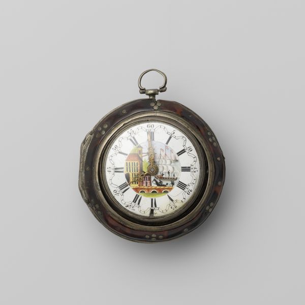 Curator: Look at this remarkable piece. An 18th-century watch from our decorative arts collection, its miniature landscape calls to me—a wistful scene whispering of another time. Editor: Intriguing. The composition immediately strikes me. The artist has framed this idealized scene within a perfect circle, segmenting the visual field by hours. Observe how this structure contains the organic form and evokes notions of controlled temporality. Curator: I agree completely, and the way the painter renders this little vista, well, it makes me daydream. Like peering into a snow globe with memories swirling inside. It's so much more than just an object telling time, isn't it? You see that tiny building on the left—do you think somebody loved and lived in it? It makes my soul dream. Editor: Indeed, a temporal device intertwined with a sentimental pastoral. And consider the subtle yet rigorous arrangement of elements within the landscape itself, the careful balance of form and color that invites a semiotic reading on 18th-century leisure ideals and nature's clockworks. Curator: You've nailed it. To me it is almost the memory of nature in perfect symmetry. And speaking of readings, you think that painter knew their work would one day spark dialogues centuries later? They would have the chills hearing this now. Editor: Perhaps. I imagine it serves as a commentary on both temporal awareness and an artificial romanticizing of daily existence, the timepiece, with all its gears, being but one tool by which we segment moments of existence for utility's sake. Curator: Exactly! I like to imagine somebody checking the time on their walk through the garden or to a lavish event. It's hard to imagine anything being more romantic than carrying a world around, bit by bit. Thank you for taking this walk through the garden of time with me. Editor: Yes, indeed, a rich exercise in seeing a seemingly quotidian artifact for its conceptual complexities. My pleasure.