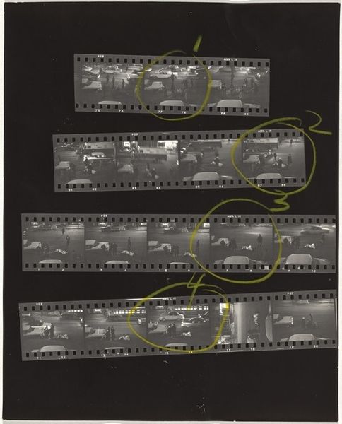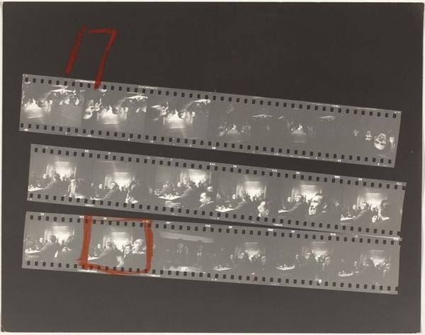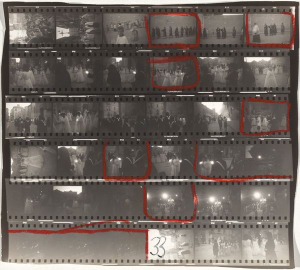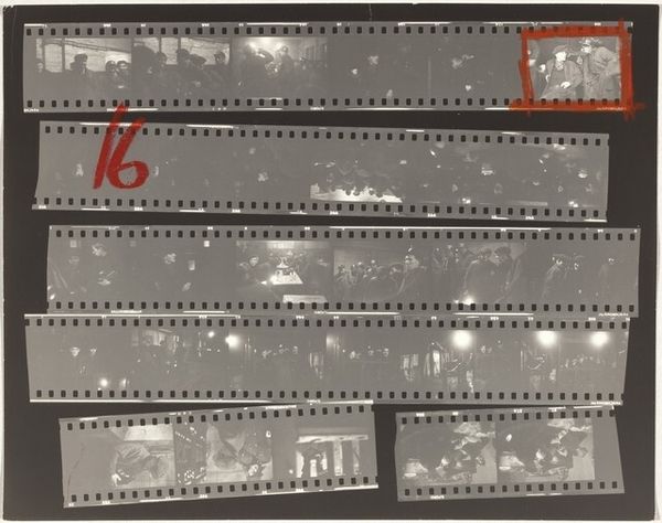 Editor: This is Robert Frank's "Trip south--Barcelona, Spain 5/Lines of My Hand 34" from 1952, a gelatin silver print. I'm immediately drawn to its structure. The grid of the film strips creates such a compelling surface pattern, and the handwritten 'S' and the red rectangles draw my eye. What do you see in this work? Curator: Precisely. It is important to look closely at the work. Consider the intentionality of Frank's choices. The photographic image is laid bare—process, selection, and ordering. Each frame interacts with the next, not as a seamless narrative but as a visual sequence. How does that selection affect the overall impact? Editor: I think that isolating some of the images in red emphasizes some frames, and implies relationships and themes within the cityscapes…but without dictating one interpretation. It feels really open-ended. What is the function of the grid? Curator: Indeed. The grid provides a structure, a method of organization. The individual frames each contain a tonal scale, from dark blacks to soft grays and stark whites. How do you interpret these patterns? Editor: They draw me into Frank's gaze. There's a sense of a journey, or a contact sheet, an incomplete sequence... Curator: And by making that selection visible, Frank draws attention to the mechanics of representation. Consider also the flatness of the plane: what might be atmospheric perspective becomes only relative tone. Did Frank seek to prioritize subjective interpretation and the visible over traditional pictorial values? Editor: I never considered how a single picture includes the artistic choices and values in every stage. The way the artist represents and prints it—that's crucial. Curator: Indeed. Frank invites a rigorous examination of both photographic surface and his hand at work, altering how the content operates.