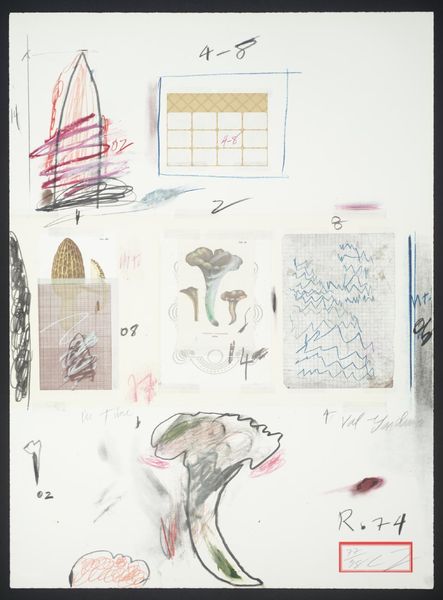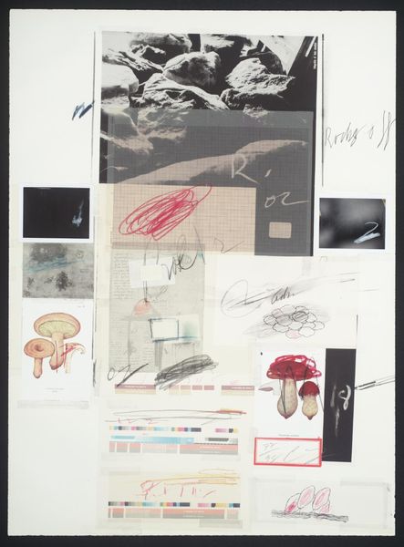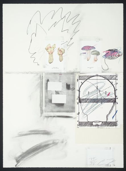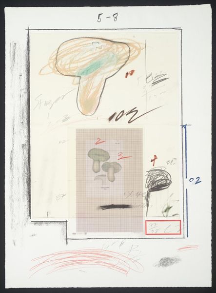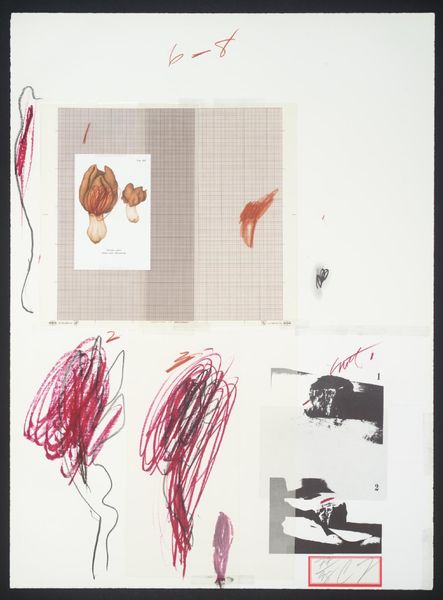 Editor: Cy Twombly’s "No. VII" is a mixed media work on paper. It’s... unusual. The mushroom imagery juxtaposed with the grayscale photo makes me wonder: what's going on here? How do you interpret this work? Curator: Considering Twombly's practice, it's crucial to examine the materials. We see collage, drawing, and photographic reproduction. These different modes of production point to an interest in how images are made and circulated, wouldn't you agree? Editor: Absolutely, the layering is key. It's like he's revealing the building blocks of image construction. Curator: Precisely. Twombly challenges traditional notions of artistic skill by emphasizing process over representation. Notice the seemingly arbitrary arrangement, potentially disrupting the hierarchy between high and low art. Editor: I see that now! So it's not just about what's depicted, but how it's made and what that says about art itself. Thanks! Curator: Indeed. Reflecting on the means of production brings us closer to understanding the artist's intent and the artwork's cultural significance.
