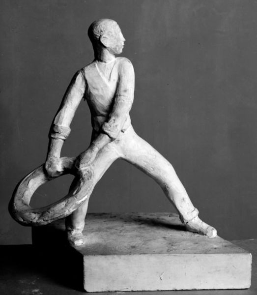 Curator: What strikes me immediately is the figure’s strength—not in a bulging muscles sense, but a grounded power, balanced and intentional. Editor: Indeed. The bronze sculpture, "First Arabesque" by Edgar Degas, dating roughly from 1850 to 1920, presents a fascinating study in motion, particularly the codified gestures of ballet. It begs us to consider whose stories get immortalized in bronze, and the gazes through which they're interpreted. Curator: Right. Consider how the arabesque is such a revered pose, embodying aspiration and ethereal beauty. The symbol of the dancer’s form here really emphasizes control, precision. You see that in her extended limbs. Is this reverence a reflection of its power in the 19th century? Or is Degas attempting to disrupt these conventional ideals? Editor: Well, as Impressionism challenged academic painting norms, this bronze suggests a broader negotiation. While appearing classical on the surface with the dancer in the nude, this subject—a ballet dancer, someone from a lower socio-economic background—allowed him to depict modern life in an evolving Paris. This tension of beauty and labor feels incredibly relevant when assessing gendered body expectations today. Curator: You can see, for example, how she leans so dramatically forward, poised and controlled. It makes me think of ritual gestures in various traditions, moments that can both transport the practitioner and bind the community. How might her positioning here offer a symbol of hope? Editor: It's less of hope for me, and more about capturing a certain raw struggle. These were often young women of lower classes who were economically vulnerable, even exploited. It speaks volumes about the limited choices afforded to them, and the performances expected from them under constant surveillance. Degas often placed himself among ballet patrons from wealthy backgrounds, raising questions about spectatorship and the dynamics of power at play here. Curator: This piece really leaves you reflecting on the beauty in fragility, strength through vulnerability. Thank you for that illuminating reading. Editor: My pleasure. Examining the context is essential for acknowledging art's role within broader societal discourses. Hopefully, this pushes all of us to seek more voices, narratives, and bodies represented in these cultural spaces.