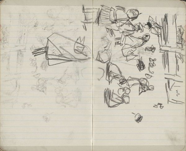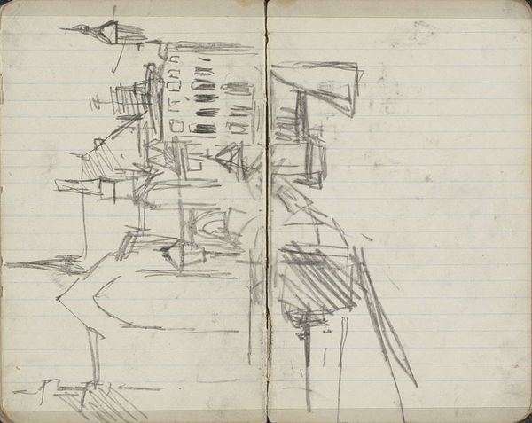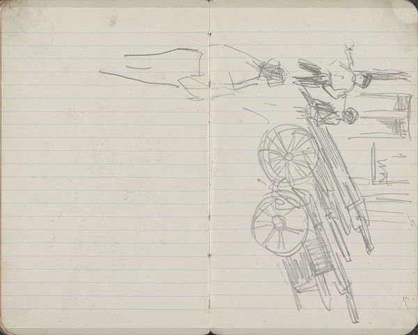 Editor: This is "Figure by a Machine or Boiler," a drawing by George Hendrik Breitner, created between 1896 and 1897. It looks like it's done in ink and pencil on paper, probably a page from a sketchbook. There's something stark about this quick sketch. How do you interpret this work? Curator: Breitner often depicted the gritty realities of Amsterdam life, and this sketch seems to delve into the rapidly industrializing world of the late 19th century. What do you notice about the figure's relationship to the machine? Editor: It seems small and somewhat lost beside this imposing structure. Almost like the machine dwarfs them? Curator: Precisely! Think about the social context of that time. Industrialization brought about immense societal changes, impacting labor, class structures, and even individual identity. The figure’s diminished presence beside the machine invites us to contemplate their alienation within this new industrialized landscape. What do you think about the perspective he chooses? Editor: I suppose it could also say something about their power in relation to each other. Is he trying to make a comment on labor by obscuring it in a quick sketch? I think the lines create a stark contrast of man vs machine. Curator: Yes, there's an interesting tension isn't there. He does leave space to interpret the image by use of heavy lines in some instances. This drawing pushes us to consider labor's place in modernizing European cities during that period. Editor: That really reframes how I initially saw it. I was mostly focused on the artistic style, but now I am wondering what Breitner felt about the changes brought by industrialization. Curator: Exactly! And perhaps consider your own position in a society still grappling with questions about labor, technology, and our place in the world. Editor: It’s amazing how a simple sketch can reveal so much about history and ourselves.