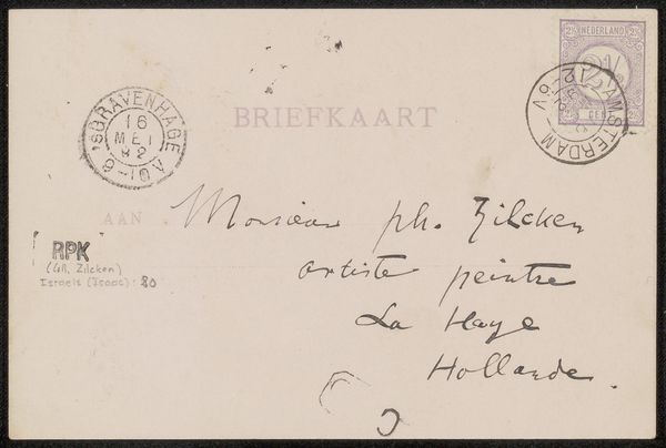 Editor: Here we have "Briefkaart aan Jan Veth," thought to be from 1886, made by Willem Witsen, using pen and ink. At first glance, it’s simply a handwritten postcard. It's interesting to see the details of its journey through the postal system, all those stamps. What's your take on it? Curator: This unassuming postcard is quite revealing about the art world of the late 19th century and the networks sustaining it. We see here the infrastructure of artistic exchange. What details can you find of the address? Editor: It’s addressed to "Mr. Jan Veth, Art Critic" at an address on "Remony Straat" in Amsterdam. What significance does the recipient’s title have? Curator: The fact that Witsen is corresponding with a known critic suggests a careful attempt to cultivate a relationship, maybe even sway a future review. We must also consider the societal role of art critics as gatekeepers. They could significantly influence an artist's career trajectory and public perception. Does it surprise you that such exchanges happened, in effect "behind the scenes?" Editor: It does give you a different view on how the art world actually functions! What else jumps out at you? Curator: Note the date and the Amsterdam postage. We also see, from other handwriting, it’s being treated as an archival document: “(Br. Jan Veth) W. Witsen: 16”. The very existence of this postcard in a museum collection highlights the constructed nature of art history and which pieces of communication and art were selected to represent artists by museums. Editor: So, a simple postcard becomes a lens to view artistic influence and art history's selection process! I had no idea!