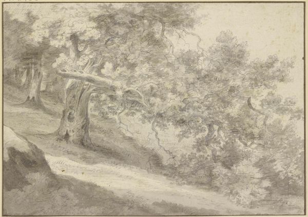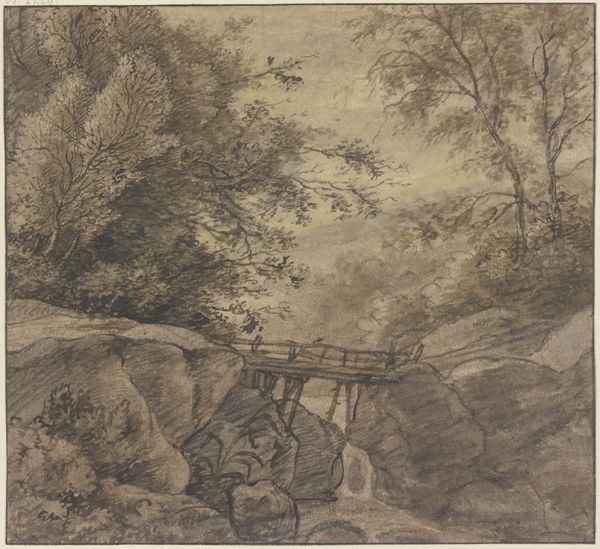 Curator: What a delicate and serene scene. It feels like a captured memory, or a stage set for introspection. Editor: Indeed. We’re looking at "The Swiss Bridge at Elswout Manor," a pencil and graphite drawing on paper by Franciscus Andreas Milatz, created sometime between 1790 and 1800. The work offers us a picturesque view of a rustic bridge. What strikes you as you continue to observe this artwork? Curator: It’s the light. That soft, pervasive light bathing everything, even in what should be shadow. The lack of true darkness almost feels dreamlike, and emphasizes the fragility of the bridge, which, if you think about it, is what ties the people to each other. And the nature embracing the bridge. The balance of each aspect. Editor: I'm drawn to the figures on the bridge. They're quite small in the overall composition, almost swallowed by the landscape. And even smaller, but maybe on closer look we see the bridge can be perceived as a symbol of transition and human intervention within the natural world. It evokes themes of Romanticism with its emphasis on emotion, individualism, and the awe of nature. But can also reference social class; a privileged view afforded to inhabitants of the Estate vs the everyday rural population, don't you think? Curator: Hmmm. Yes, perhaps... And what is interesting to me is the tension created between the careful details and the broader sweep of light and shadow, It creates a dance between reality and something far less solid... Do you feel a nostalgia seeping through the picture, too? Like something fading from existence? Editor: Most certainly. Given that this work dates back to a period marked by social and political upheavals, like the French Revolution and the rise of nationalism, the artwork could be seen as an attempt to escape these conflicts into a world of serene beauty, untouched and timeless. A world available to few and reflecting back the idea of ownership through possession of landscape. It might reflect nostalgia for the past, perhaps a pre-industrial vision or fear for the changing present and future. Curator: Right, right, right! So true. Thinking about it now, this artwork for me now resonates a bit like holding onto a feeling or thought before it vanishes completely. As a whisper, which once lingered so bold. Thanks! Editor: Thank you. And it reminds me of how art serves as a witness to its time. Always revealing the intersection of political awareness, history, emotions, society and how we perceive beauty.