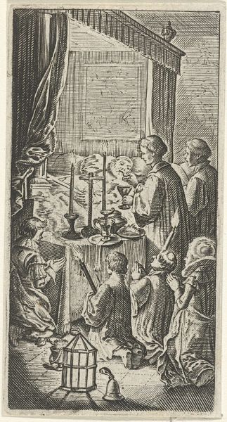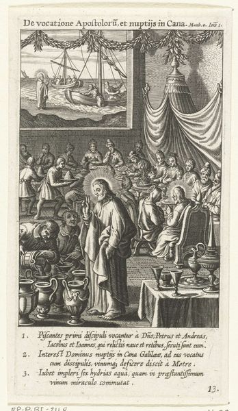 This is Boëtius Adamsz. Bolswert's engraving depicting Christ's visit to Zacchaeus’ home. Made using detailed lines, the composition divides into distinct narrative spaces that invite you to explore its structural arrangement. The architectural backdrop contrasts sharply with the natural scene where Zacchaeus perches in a tree, setting up a binary between the constructed world and nature's realm. Notice how light radiates from Christ, visually connecting him to Zacchaeus and highlighting the transformative encounter. The table laden with food further enhances the contrast, symbolizing worldly wealth against spiritual enlightenment. Bolswert employs a semiotic system where spatial arrangement and light function as signs, guiding the viewer's interpretation. The detailed rendering of textures and forms not only provides a visual experience but also serves as a means of understanding the deeper cultural and philosophical implications of salvation and social transformation. The stark contrast in textures serves to highlight the tension between material wealth and spiritual enlightenment.