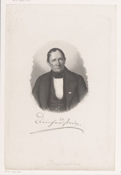 Curator: This is a lithograph portrait of Louis Marie de Lahaye, Vicomte de Cormenin, created between 1848 and 1849 by Bernard Romain Julien. The artwork is currently held in the collection of the Rijksmuseum. Editor: The first thing that strikes me is the gravitas. Even though it's a print, it feels like a formal declaration of something important. The detailed rendering of his suit, and even his slightly receding hairline, it all adds to that somber mood. Curator: Julien situates de Cormenin within the tumultuous political landscape of mid-19th century France, a period marked by revolution and shifting social orders. How might we interpret this image within debates surrounding representation and power? Editor: The carefully etched details surrounding the medal, for example. Badges and insignias like this have always signaled a certain status, a specific allegiance, I see it operating here like an old heraldic emblem declaring not just identity, but deeply held values. What about you? Curator: I see an echo of revolutionary ideals, oddly enough. It is a representation, ostensibly of power and position, but consider that the portrait coincides with a wave of popular movements, making you wonder about the sitter's involvement within broader calls for justice, in this new era, and the weight his name might have carried then. Editor: Absolutely. And in that vein, observe his direct gaze. It is not an inviting gaze, necessarily, but it suggests accountability and authority... It connects back to the symbols and position of power embedded in the print. This makes me wonder how much was de Cormenin trying to present and represent himself in this print? Curator: Yes! And doesn’t this reading, of a print created and consumed during significant socio-political transition, offer an alternative entry point into academic and traditional representational portraiture? Editor: Yes, the power dynamics, clearly represented are hard to escape, and the symbolism embedded is just, as relevant as ever. Thank you. Curator: It offers us a glimpse into the complex layers of historical narratives surrounding the very formation of modern, French society and political power during this particular time. Thanks!