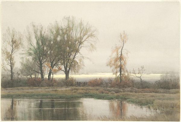 Isaac Levitan created 'Autumn' using watercolor, capturing a landscape dominated by muted tones and delicate, almost skeletal trees lining a serene body of water. The composition is structured by a stark contrast between the dark mass of the evergreen on the left and the thin verticals of the bare trees, setting up a visual rhythm that carries the eye across the scene. Levitan's choice of watercolor lends itself to a semi-transparent effect, layering washes of grey, brown, and subtle greens. This echoes the Symbolist movement of the time, where artists sought to evoke moods and emotions through nuanced color and form. The overall structure here challenges traditional landscape painting by minimizing detail. The horizon line is blurred, and the reflection in the water is soft, leading the viewer to interpret the work through its emotional resonance rather than its representational accuracy. Levitan's strategic use of light and shadow imbues the painting with a sense of melancholy, reflecting the Symbolist concern with inner emotional states over external realities. The function of this watercolor lies not just in its aesthetic appeal but in its ability to communicate the transient beauty and inherent sadness of autumn.