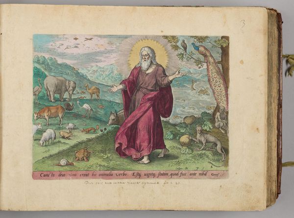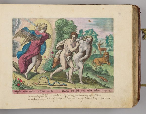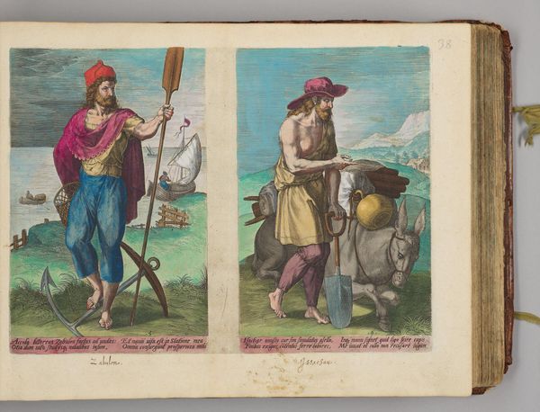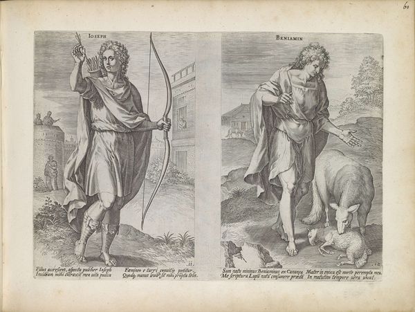 Curator: Here we have Johann Sadeler I's "Aser and Nehphtali." The way Sadeler contrasts the figures is striking. What catches your eye? Editor: The figures are quite different, Aser seems more cultivated while Nehphtali is paired with a stag. What do these symbols tell us about the figures and their meanings? Curator: Precisely! Notice how Aser is near cultivated objects: A table, chalice, fruits, a fancy jug. These objects represent the abundance and blessings promised to his tribe. Nehphtali, with the stag, embodies freedom, swiftness, and connection to nature. Do you see how the images resonate with the biblical descriptions of each tribe? Editor: I see! Aser is tied to prosperity and Nehphtali to freedom and the natural world. Thank you for unpacking the symbolism for me. Curator: It's all about understanding the visual language of the era. Images carry memories and cultural values.