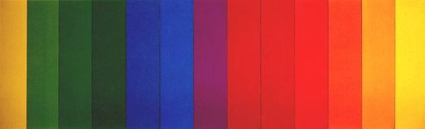 Curator: This is an untitled painting by Michel Carrade, using acrylic paint in what could be classified as geometric abstraction. Editor: The composition is quite striking! It's hard to look away from these bold, vertical stripes of vibrant color. There's an optical illusion feel too. Is it moving or static? Curator: Exactly, that is what Carrade’s works sought to accomplish; pushing the boundaries of visual perception with pieces that border on Op Art, reflecting wider trends in abstraction. Carrade's work actively engaged with contemporaneous discourses around hard-edge painting and colour-field theories, so his art needs to be assessed in this historical context. Editor: The linear simplicity emphasizes pure color and the interactions between these planes of color; those shifts between red, blue, orange – how do you read them? The eye bounces, doesn’t it? Curator: This abstraction developed parallel to the social context of urban modernization after the Second World War. The embrace of non-representational forms symbolized a progressive departure from traditional, perhaps conservative, modes of seeing and thinking. Art as an expression of modernity. Editor: Agreed! Modernity in color! This reminds me how crucial color is to formal impact, that you can derive almost tactile impressions through hues. A radical distillation of form. Curator: But look beyond the individual visual impression and reflect also on how institutions like galleries legitimized this abstract language during the Cold War period to position Western art and thought. Editor: Yes, true enough... Thank you for opening this larger horizon, bringing this historical framework to what on the surface appears like simply color and structure. Curator: The relationship between artistic vision, societal progress, and institutional endorsement always needs exploring.