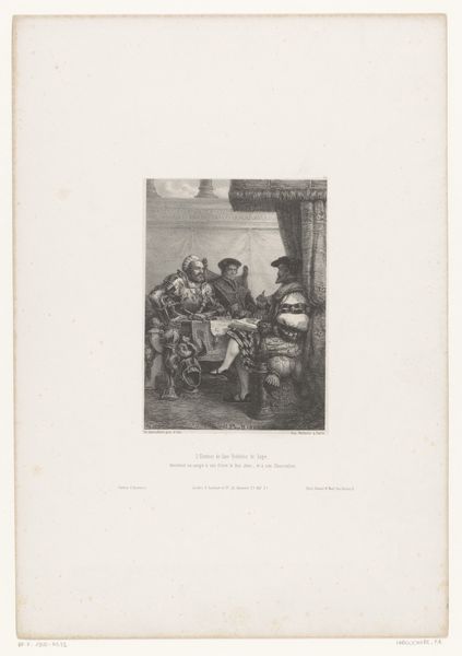 Editor: This is "Interior with a Man Smoking a Pipe and a Standing Woman," made in 1881 by Henri Emile Lefort. It's an engraving, so a print. The image feels...intimate, domestic. What strikes you about it? Curator: I’m immediately drawn to the materials – the paper itself, the way the intaglio printing process would have been so labor-intensive. Think about the engraver carefully cutting into a metal plate, a skilled artisan replicating the image. It wasn't simply about artistic expression; it was a commercial enterprise. Did this artist produce their own prints or contract it out to a printer? Editor: I'm not sure, that's a good question. I hadn't really considered the printmaking aspect as a kind of "work" or production process, but it's very visible in the medium itself. Curator: Exactly. And look at the "genre painting" theme. This isn't some heroic historical scene, but a slice of everyday life, elevated by its depiction. What does it tell us about the consumers of such images, their values and desires? The image becomes a commodity itself. It serves to reinforce specific cultural expectations. What kind of a message do you think they tried to promote to people at the time? Editor: I see, it's depicting a cozy domestic life and that gets consumed, in a way. I suppose maybe it encouraged a feeling of normalcy, or some idealized life-goal they could hope to achieve themselves? To think, even back then the materials of making and living, like the clothing, tobacco and interior decor were sending clear consumerist signals... fascinating. Curator: Precisely. It’s not just a snapshot. It’s deeply embedded in systems of production and consumption. Editor: Thank you, that really gave me a new lens through which to view not only this art piece, but so much of the work displayed here! Curator: The pleasure was all mine! Examining these artworks by considering the material culture and societal expectations opens up more questions than answers.
