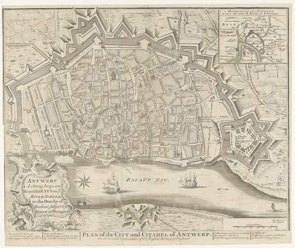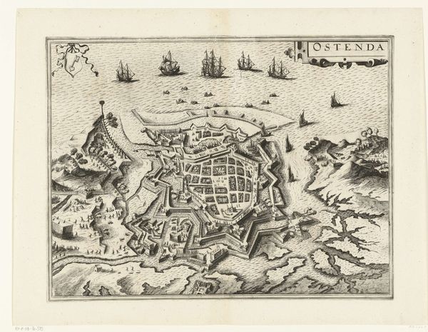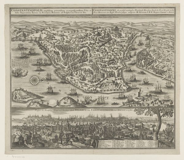 Editor: Here we have "Plattegrond van Lissabon met een gezicht op Lissabon tijdens de aardbeving in 1755" made between 1755 and 1757, attributed to Matthaeus Seutter. It appears to be a meticulously rendered print of the city, contrasting sharply with the chaotic depiction of the earthquake's aftermath below. What strikes me most is the detailed rendering of the city's structure above the utter devastation below. What do you see in this piece? Curator: This engraving presents us with a fascinating duality, doesn't it? It depicts not only a city but also a pivotal moment in its history through the lens of its production. Let's consider the materials: ink and paper. These readily available, mass-produced materials democratize the distribution of this powerful image, reaching a wider audience far removed from the immediate reality of the earthquake. Editor: So the print itself is a kind of industrial product, reflecting the social context in which it was made? Curator: Precisely. It's crucial to understand how this image functioned as a commodity. Prints like these satisfied a public hunger for news and spectacle. The depiction of the earthquake becomes almost like a consumable object, a mediated experience of disaster. Consider how the artist used readily available methods to duplicate an image across various geographies. Editor: I see, the stark contrast emphasizes both the power of nature and, perhaps, the vulnerability of human constructs, but filtered through the marketplace of images. Curator: Indeed. And that mediation itself is the product of very specific labor and production methods. Ask yourself, how does the choice of a mass-producible print change the event being represented and consumed? The very act of representing a catastrophe as a saleable print alters its meaning. What did you think of that today? Editor: I never considered it in this way. The print’s function as a distributed, reproducible artifact is something to think about. Curator: Exactly, analyzing the materials and means of production illuminates the artwork’s purpose beyond mere representation, which gives greater context and awareness to modern mediums.