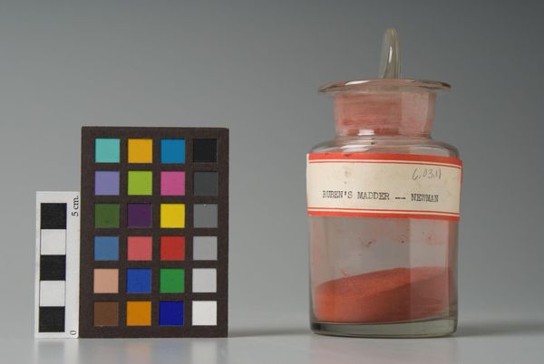 Curator: Here we have "Pink Madder," an intriguing pigment manufactured by James Newman. Editor: The color and glass have an interesting muted quality; it looks almost dreamlike. Curator: Pink Madder was historically significant; a common colorant, its availability shaped artistic production. Editor: The composition, with the color swatch beside the jar, creates an interesting visual dialogue. Curator: Its presence in collections signifies changing attitudes towards artistic materials and their place in the artistic ecosystem. Editor: I agree; it's a surprisingly moving arrangement of color and form.