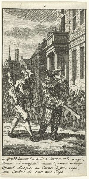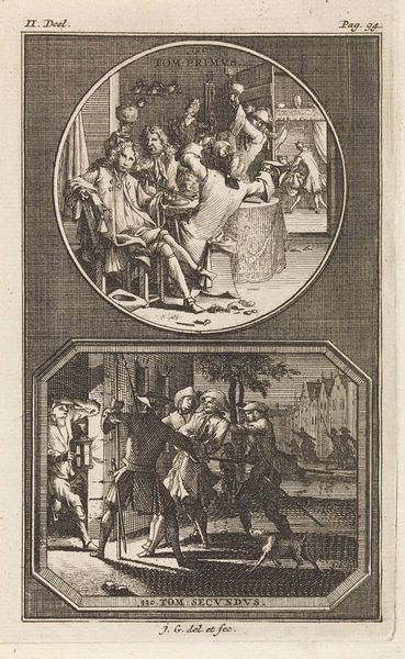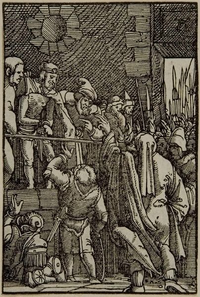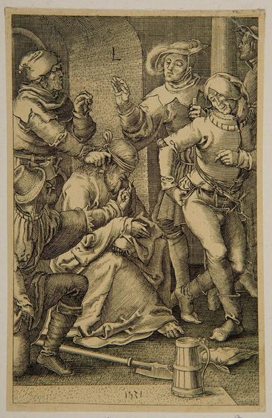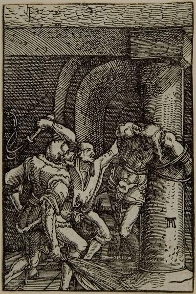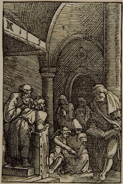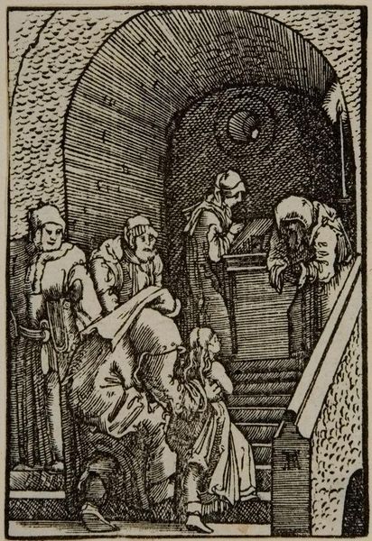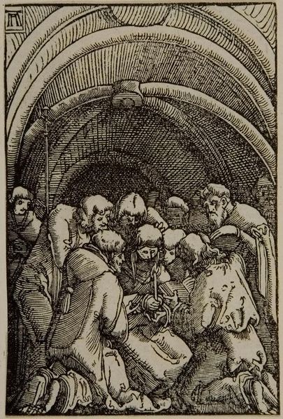 Curator: This arresting woodcut is Albrecht Altdorfer's "Christ before Caiaphas; Caiaphas Tearing His Clothes". Editor: The scene feels instantly claustrophobic, doesn’t it? The density of line work is almost overwhelming, heightening the tension. Curator: Indeed. The composition focuses our attention sharply. Note how Altdorfer uses the density of cross-hatching to suggest depth and shadow, creating a theatrical space. Editor: The figures are rife with symbolism too. Caiaphas’ dramatic gesture of tearing his clothes speaks volumes about the power dynamics at play and the performative nature of religious authority. Curator: Precisely. The formal elements underscore this. The agitated lines and compressed space contribute to a feeling of imminent crisis and the injustice Christ faces. Editor: It’s remarkable how Altdorfer uses such a small format to convey such intense psychological drama and critique religious power structures. Curator: Yes, the piece exemplifies how formal innovation can amplify critical narratives.