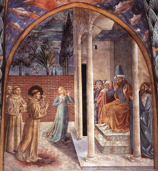 Curator: So much stillness and yet, it feels utterly vibrant, doesn't it? Editor: Yes, it does. It’s as if Benozzo Gozzoli, around 1452, paused time within this fresco—entitled “Establishment of the Manger at Greccio”—allowing us to eavesdrop on a pivotal moment of faith. It’s Renaissance art embracing a kind of narrative transparency. Curator: Right! There's almost a theatrical quality. The careful architecture in the background reminds us that even spiritual moments are witnessed, staged, performed for a community—then and now. And look how he plays with perspective to invite you into this almost intimate scene. Editor: And how odd! An indoor nativity with real barnyard animals inside a Gothic basilica... Very bizarre if you think about it too much. But it makes you reflect, perhaps, that something divine, like the incarnation, could just spring out anywhere! Curator: Precisely. It speaks to the democratizing impulse of the Franciscan order that this work illustrates, really. Greccio was a small town and Saint Francis staged the Nativity to allow even the most unlettered person access to a divine story. So even the animals play a central role in creating this accessibility. Editor: You know, beyond the socio-religious impact of works like these, what really grabs me is the expression on the Saint’s face while he holds the Christ Child—as if Gozzoli caught the purest reflection of love imaginable. Like a fleeting spark in the infinite night. Curator: Yes, an almost dreamlike sense pervades, yet it is grounded by that intense gaze. This balance between ethereal and earthy reminds us of art’s enduring power to make complex spiritual narratives felt on a human scale. Editor: Yes, this really resonates, like how an ancient story gets etched on our mind not by its dogma, but through the vivid colors of our own imagination. Curator: Well put. Gozzoli managed to create something timeless and deeply moving, even centuries later. Editor: It definitely reminds us that masterpieces don’t only need technical excellence but a whole lot of genuine passion that can survive over time.