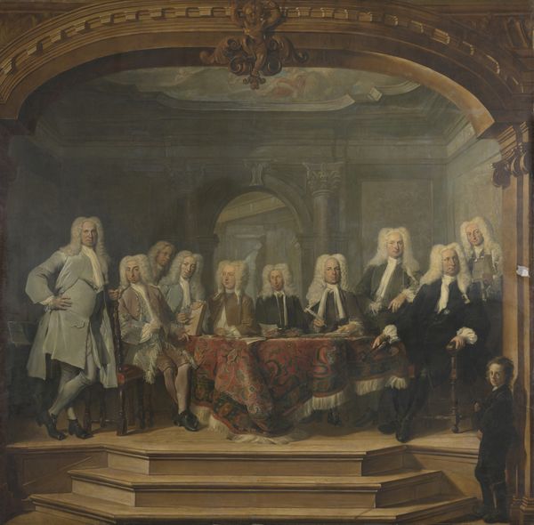 Curator: Joseph van Aken’s “An English Family at Tea” captures a moment of domesticity, rendered in oil on canvas. I’m immediately struck by the stiff formality, aren’t you? Editor: Absolutely. There's a sense of performance here. Note the carefully arranged tea service, almost like a still life within the portrait. Tea itself, newly fashionable, signaled wealth and refinement. Curator: And the classical statue looming in the background! Such a blatant display of cultivated taste, though I do find it slightly humorous how it seems to be judging the family. Editor: It’s aspirational, isn't it? The statue, like the tea, symbolizes the family's desire to align themselves with timeless ideals, even as they participate in a very specific, contemporary ritual. Curator: You see, it makes me wonder what they’re really thinking behind those powdered wigs and polite smiles. Editor: Perhaps they are wondering the same about us. It makes me question the difference between what is posed and what is intimate.