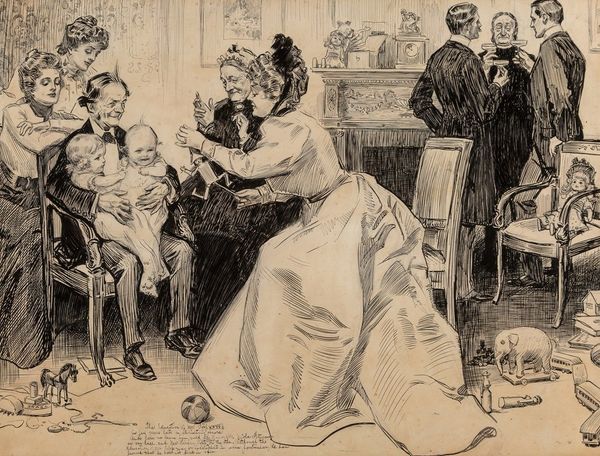 Editor: Here we have Gustave Doré’s "Street Scene," possibly from 1854, a drawing and print in pen and pencil. The way the women in the foreground are rendered, set against a blurry background of men in top hats, gives the piece a slightly satirical mood. What's your take on it? Curator: Satire, certainly, but let’s consider the societal context. Doré lived through a period of intense social and political upheaval in France. What might the prominent depiction of these bourgeois men suggest about the power dynamics of the time? Editor: Power dynamics, right! I hadn't considered how literally *stacked* the men are behind these women. It almost feels like the patriarchy closing in. Curator: Precisely. Consider also how Doré's work often depicted urban life and the disparities within it. How does this specific image, with its focus on fashionably dressed women and observing men, reflect the changing role of women in public spaces during the mid-19th century? Do you notice any tension? Editor: There is definitely a contrast. The women, though finely dressed, appear almost vulnerable, gazed upon and judged. It's like they're on display. I'd also suggest the unfinished aspect adds a layer of… uncertainty, even instability, to the scene? Curator: Exactly! The sketch-like quality adds to that sense of unease and, perhaps, commentary on the fleeting nature of such social scenes and the position of women within them. Do you see that related to other pieces of genre painting? Editor: I can definitely see echoes of this sentiment in other Realist pieces, although Doré's distinct style and historical perspective set it apart. I learned so much. Thank you. Curator: A fascinating image, isn't it? It makes you wonder what stories lie behind those faces and what societal currents they represent, even today. I’m glad we had a chance to talk it through.