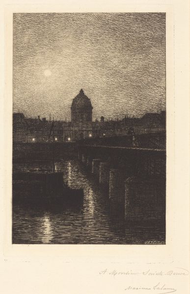 Curator: This is Louise Ravn-Hansen’s etching, "Fra Peblingesøen," or "From Peblinge Lake," created in 1889. What strikes you initially about the composition? Editor: It’s predominantly dark, almost monochromatic, creating an eerie sense of nocturnal stillness. The skyline’s silhouette against the luminous sky anchors the work despite the inky blacks. Curator: Precisely. Hansen employs etching masterfully here. The density of lines defines the architectural forms along the lakefront while varying the mark-making evokes the shimmering quality of water and light. She renders realism through an impressionistic lens, what could it reflect about that time? Editor: One could see how the image responds to the rapidly changing urban environment in Copenhagen at the close of the 19th century, caught between tradition and modernity. Those silhouettes represent not only buildings but the forces shaping Danish society. Curator: Considering her etching as print, she’s not aiming for a pure mimesis of visual reality but offers her subjective reading. The texture, almost like velvet on the paper, and distribution of tones build the image; the contrast captures what semiotics would label as a "sense of place," that is part the city itself and part human's impact to the city. Editor: That balance of dark and light, or absence and presence is fascinating; the stark silhouette and their ethereal reflections underscore her subtle, symbolic interpretation, maybe suggesting her perception of her country back then. What this urban change means, her hopes, anxieties. Curator: Agreed. It really is a quiet yet intense piece, both realistic in its subject and profoundly impressionistic. Editor: Yes, one starts by just feeling the overall dark mood, and then starts decoding everything with some kind of semiotic urban language, it’s definitely powerful, beyond the realistic elements.